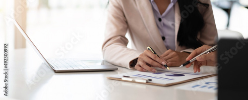 Business people meeting to find analytical ideas pointing to the graph at the office.