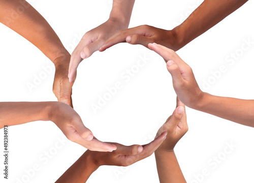 Conceptual symbol of multiracial human hands making a circle on white background with a copy space in the middle
