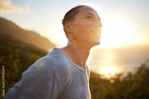 Its such a beautiful morning. Shot of a young taking a breather during his outdoor training.