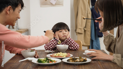 closeup of unhappy Asian preschool boy shaking head and saying no to eat at dining table to his mom and dad at home