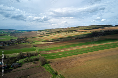 Aerial view of plowed agricultural fields with cultivated fertile soil prepared for planting crops between green woods in spring