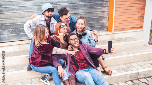 Happy millennial friends taking selfie with crazy funny faces outdoor - students take a picture sticking out their tongues sitting outside the college - friendship concept people having fun together