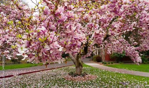 A Magnolia tulip tree in full bloom in Salem Oregon