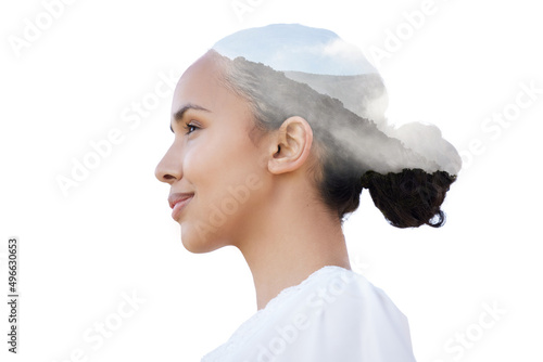 We can learn a lot about beauty from nature. Shot of a beautiful young woman with a mountain superimposed over her face against a white background.