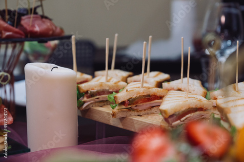 Sandwich with ham, cheese, tomatoes, lettuce and toasted bread.