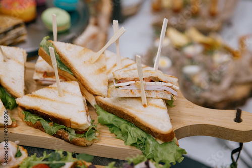 Sandwich with ham, cheese, tomatoes, lettuce and toasted bread.
