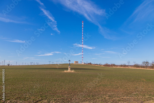 Spring landscape with high voltage poles. In the background a television transmitter and in the foreground the Passion. The sky is blue.
