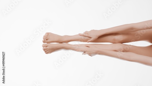 Vertical view medium shot of slim woman touches her smooth legs on white background | Flawless legs concept