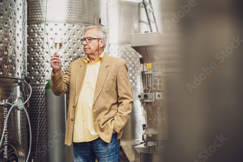 Portrait of senior man who owns winery. He is standing beside wine storage tanks and tasting wine.