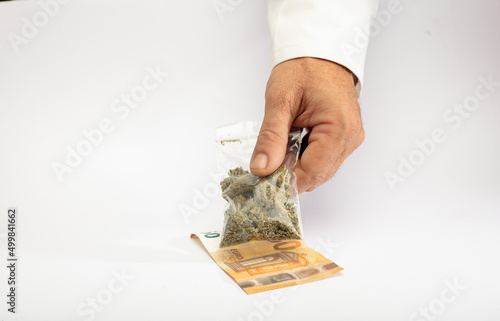 Hemp and drugs bag of marijuana in hand, delivery gestare, money, white background.The concept of selling marijuana, hemp and drugs