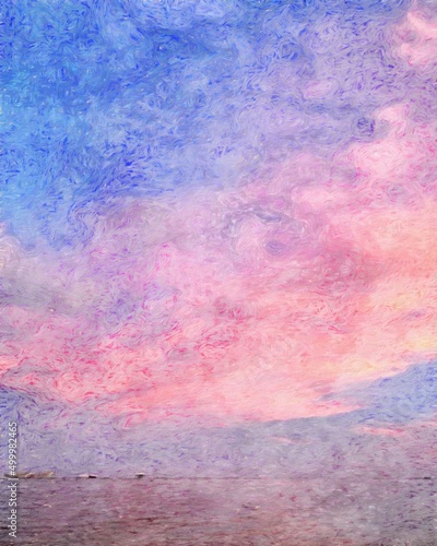 Nature landscape painting in oil pictorial art, famous travel and tourism place, outdoor vacation trend print for poster, paper, textile or canvas. Modern fine arts design wallpaper. Wall art drawing
