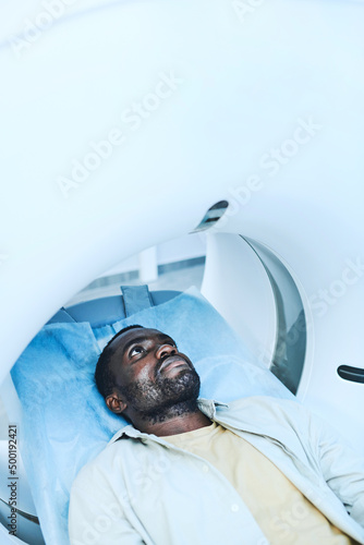 Serious young African-American patient with stubble lying on couchette of MRI machine while undergoing procedure