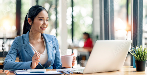 Young beautiful and charming busineswoman smiling and working on laptop computer at office.