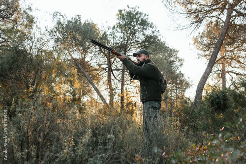 Hunters on hunt. A hunter walks through forest among trees in search of wild birds or wild animals. Hunters with gun and rifle on hunting in fall season. Hunter during hunting on elk in forest.