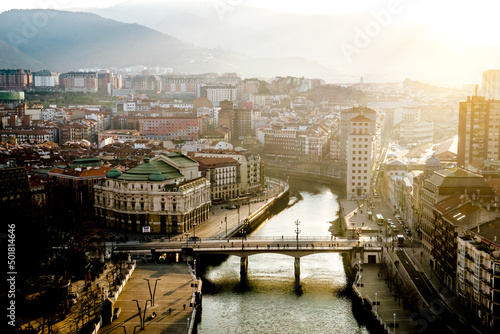 Bilbao skyline, view from above. Beautiful city between mountains on the Spain north.