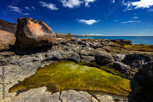 Widok na Ocean Atlantycki i niebo z białymi chmurami na wyspie kanaryjskiej, Lanzarote, Hiszpania