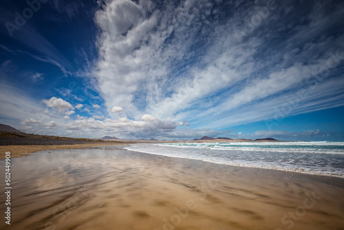 Widok na Ocean Atlantycki i niebo z chmurami na wyspie kanaryjskiej Lanzarote, Hiszpania