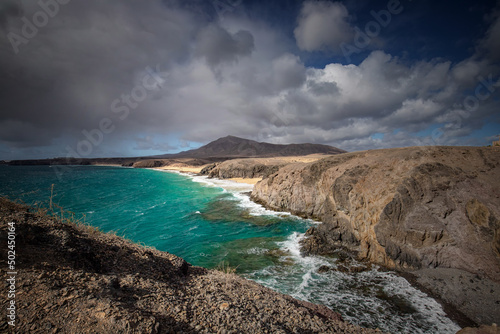 Widok na lazurowy Ocean Atlantycki i niebo z chmurami na wyspie kanaryjskiej Lanzarote, Hiszpania