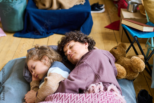 Adorable boy with blond curlt hair and his mother sleeping under plaid of blanket on the floor of room with mattresses for refugees