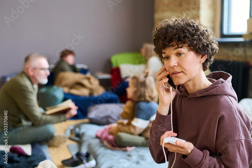 Young woman with dark short curly hair communicating on mobile phone in front of camera against group of temporarily homeless people