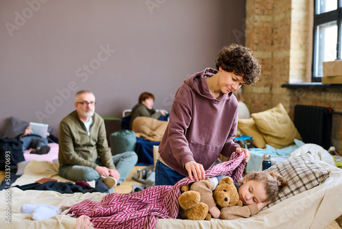 Young brunette woman covering her sleeping son with teddybear with warm blanket against other temporarily homeless people