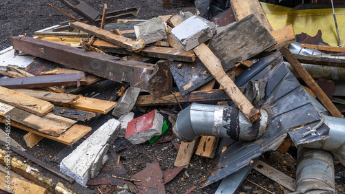 Construction garbage is piled up at site after building repair. Trash heap. Pile of home rubbish thrown after renovation.