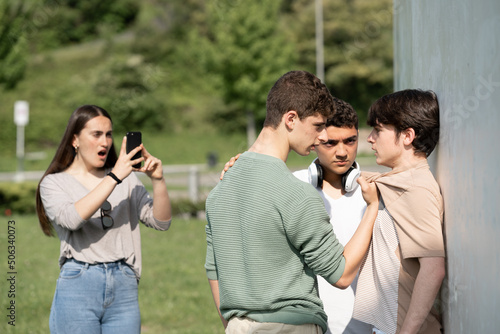 Two bullies menacing teenager boy and girl filming on phone. Cyber bullying and violence concept.