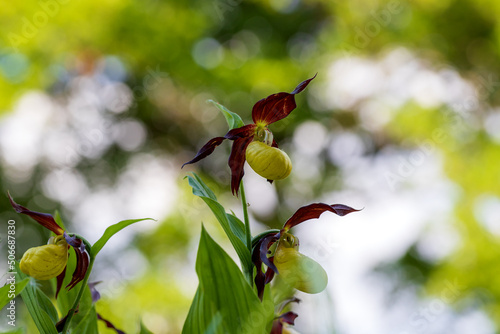 Cypripedium calceolus beautiful yellow flower on green background with nice bokeh.