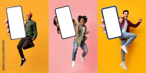 Three happy multiracial millennial guys showing smartphones with empty screen