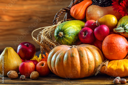 Thanksgiving day close up still life. Pumpkin harvest in wicker basket. Squash, vegetable autumn fruit, apples, and nuts on a wooden table. Halloween decoration fall design