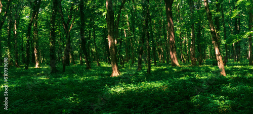 forest landscape, shady temperate broadleaf forest with sun spots on the undergrowth