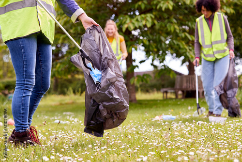 Close Up Of Female Volunteers Picking Up Litter In The Countryside