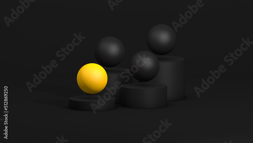 Abstract simple composition with cones of pedestals and black and gold glossy spheres. 3d render