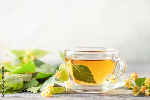 Glass teacup of green tea and linden flowers and birch leaves on wooden background. Herbal hot drink