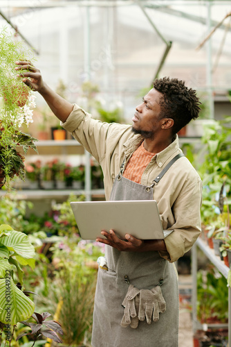 African young florist using laptop to know how to care about special kind of plant in flower shop