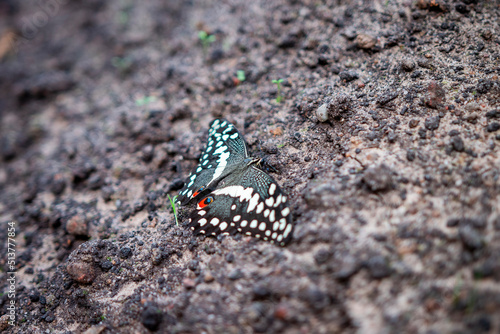 Egzotyczny motyl siedzący na ziemi. Unikatowy osobnik motyla z Azji
