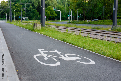 Droga rowerowa w kierunku skrzyżowania. Ścieżka dla rowerów w mieście.