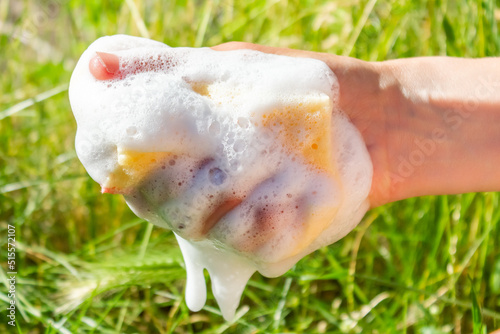 The human hand squeezes out a sponge. Yellow sponge with foam.