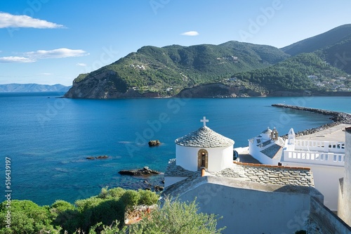 white traditional church on an island in Greece. Skopelos island, Greece