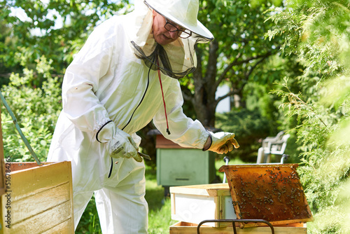Beekeeper working among beehives in a rural area