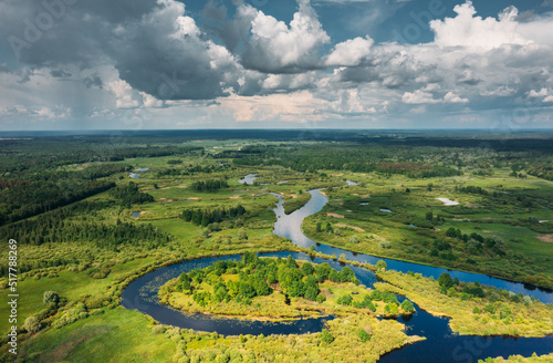 Aerial View Of Green Forest, Meadow And River Landscape In Summer Day. Top View Of European Nature From High Attitude In Summer Day. Bird's Eye View Nature Of Belarus. Summertime. Summer Background