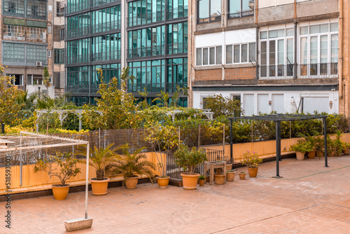 patio or courtyard between apartment buildings in Barcelona, Spain. Plants in ceramic pots and metal construction for drying clothes