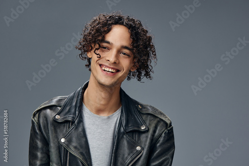 Cheerful smiling stylish tanned curly man leather jacket posing isolated on over gray studio background. Cool fashion offer. Huge Seasonal Sale New Collection concept. Copy space for ad
