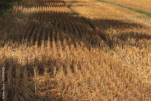 Stubble field after harvest, with rows of golden straw catching the sunlight. Shadows add depth and rhythm to the rural landscape, evoking calm, autumn, and agricultural tradition