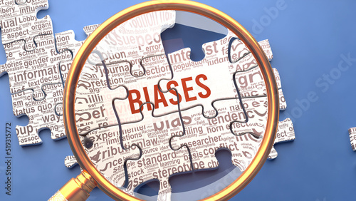 Biases as a complex and multipart topic under close inspection. Complexity shown as matching puzzle pieces defining dozens of vital ideas and concepts about Biases,3d illustration