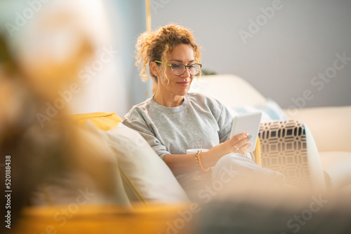 Young mature woman smile and enjoy time reading an electronic book on tablet reader device comfortably sitting on the sofa at home in indoor leisure activity alone. Female people have relax indoor