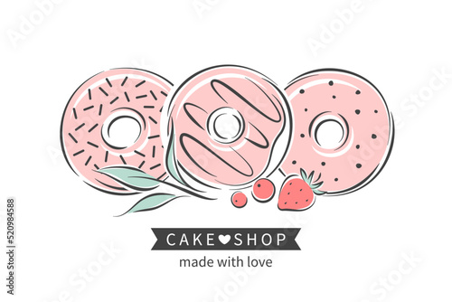 Cake and bread shop logo. Donuts and berries. Vector illustration for logo, menu, recipe book, baking shop, cafe, restaurant.