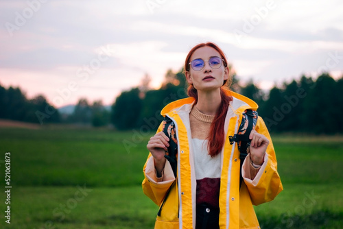 Portrait of a female tourist with a backpack in glasses wearing yellow coat. Young woman travels during summer or autumn season. Hitch-hiking, trip and travelling concept.