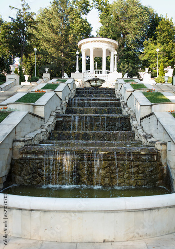 Restored rotunda and cascade ladder filled with water in the park pleases visitors. Fine architectural construction