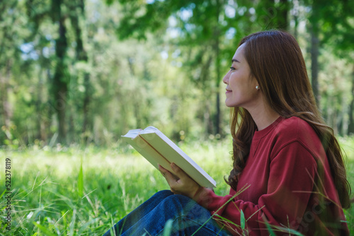 Portrait of a beautiful young asian woman reading a book while sitting in the park